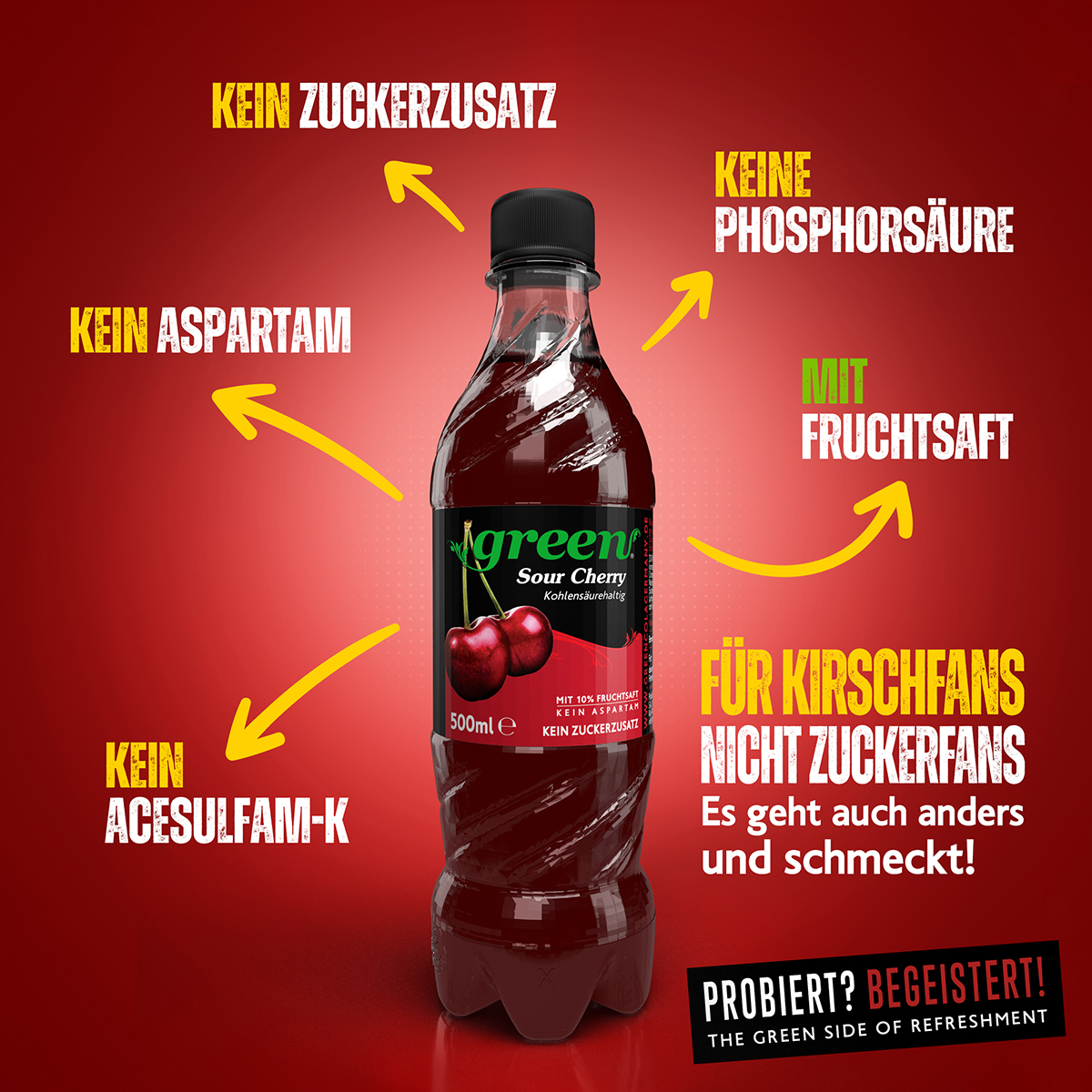 Kalorienarmes, kohlensäurehaltiges Erfrischungsgetränk mit Sauerkirschgeschmack, mit Süßungsmitteln. Ohne Zuckerzusatz. Enthält natürlich vorkommenden Zucker.