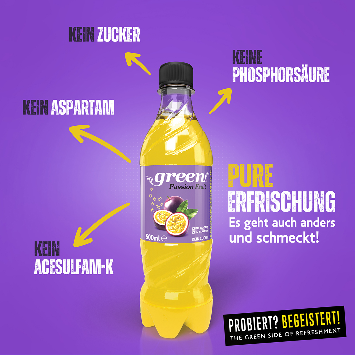 Kalorienarmes, kohlensäurehaltiges Erfrischungsgetränk mit Passionsfruchtgeschmack, mit Süßungsmitteln. Ohne Zucker.