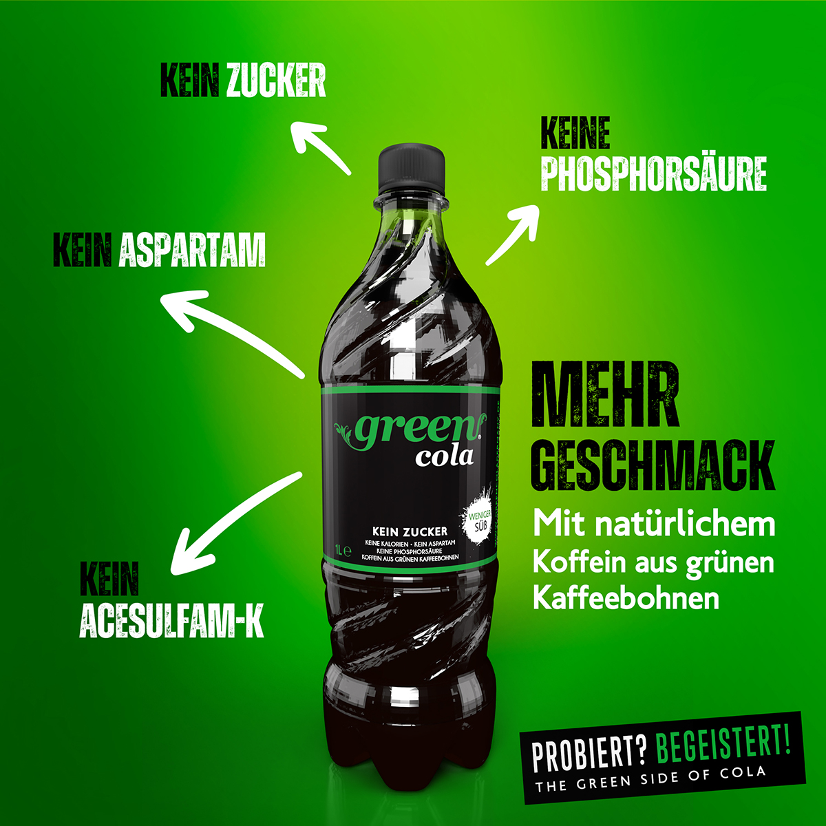 Kalorienarmes, koffeinhaltiges Erfrischungsgetränk mit Süßungsmitteln. Ohne Zucker.